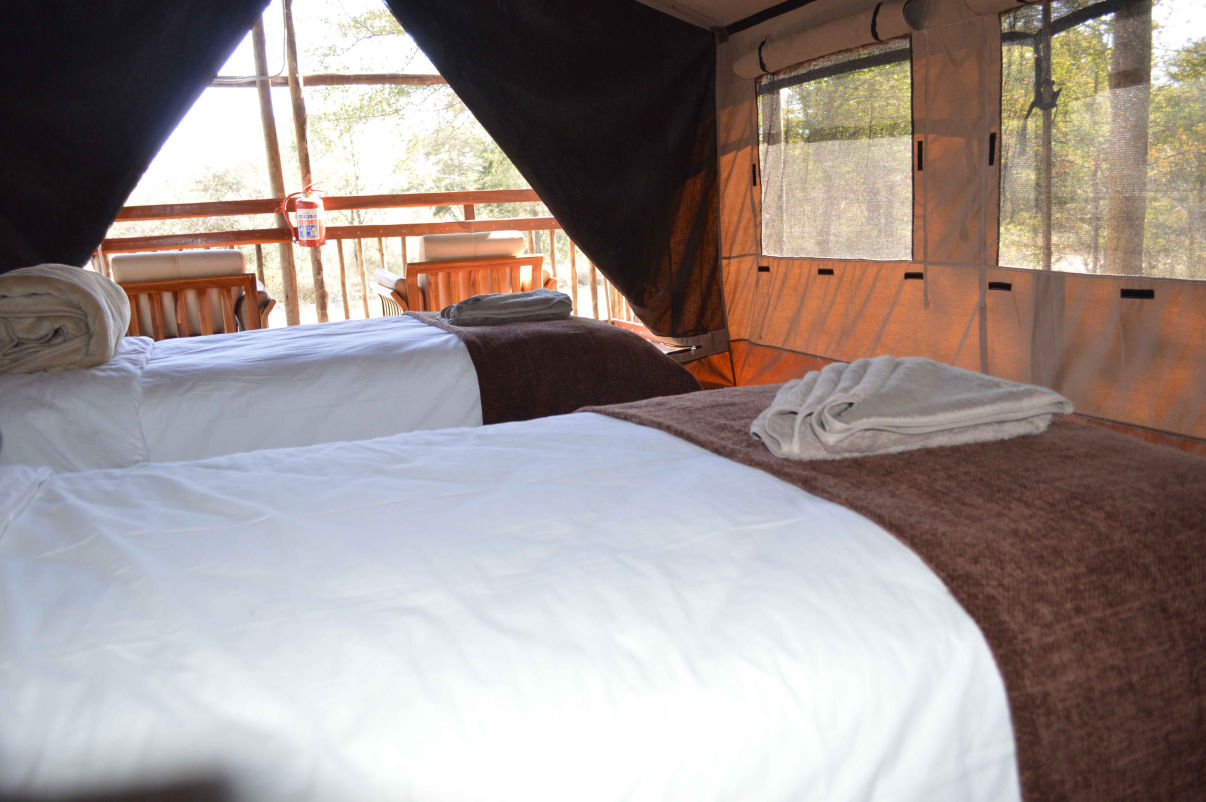 Located in a grove of purple-pod cruster-leaf trees, Sikereti Camp now boasts a tented camp with eight (8) self-catering units. Each of the spacious en-suite units has an elevated deck, a braai area and parking area. The camp also offers four (4) campsites, each with its own private washing up area, hot water showers fired by a donkey, flush toilets and a central fireplace. Campsites can accommodate groups of up to four vehicles travelling together. The central guest area, scheduled for completion in May 2023, will afford guests all the important creature comforts one would normally expect from a world-class safari experience such as Khaudum National Park.