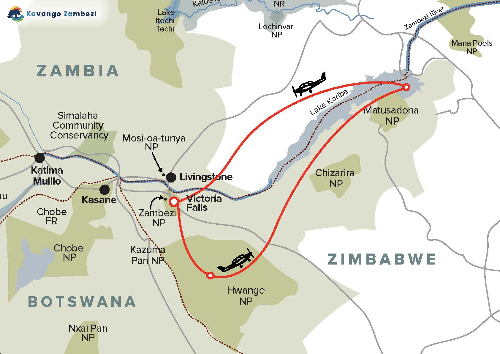 Fly from Robins Camp airstrip to Bumi Hills airstrip, then road and boat transfer to Musango